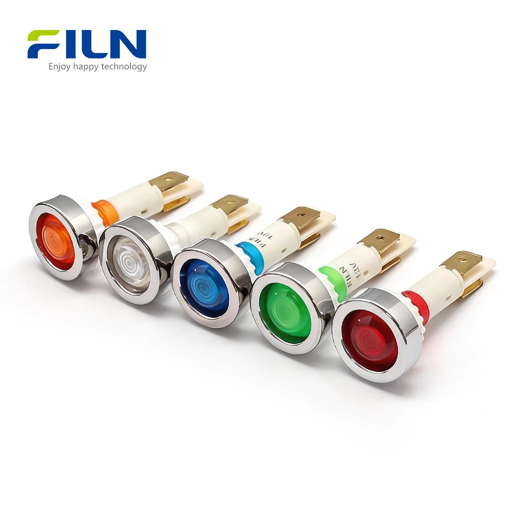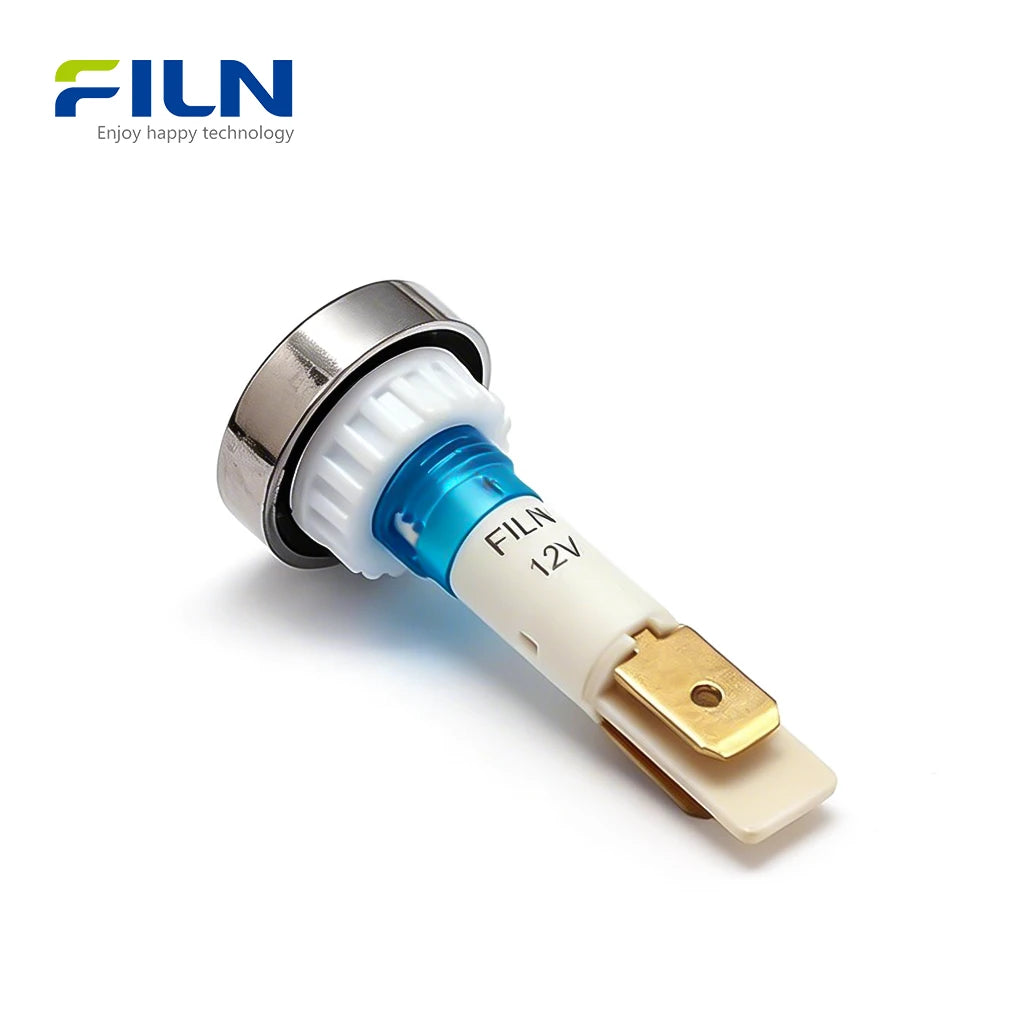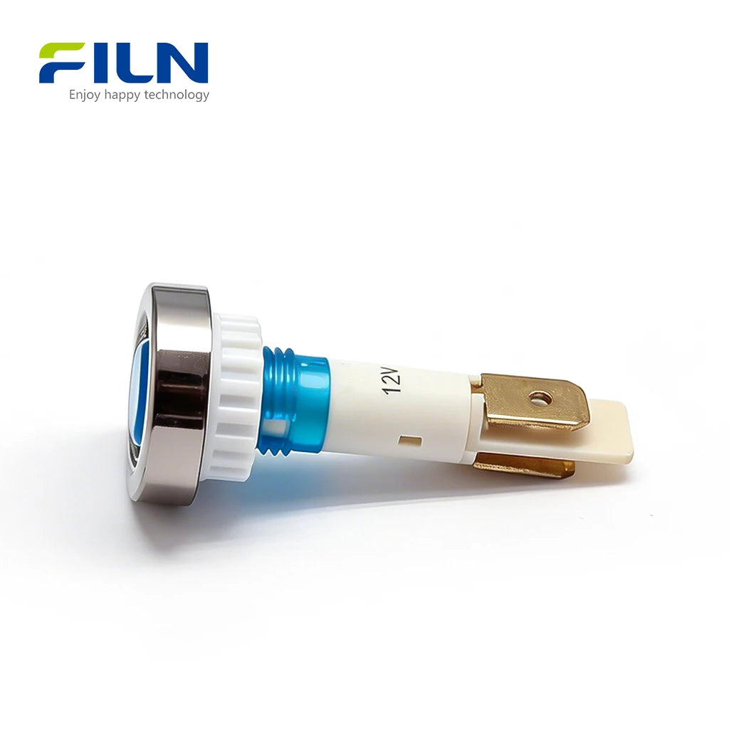 Product OverviewThe 12v indicator lamp (Model: FL1P-10NJ-1) is a premium 10mm plastic indicator light factory solution designed for industrial and commercial applications. This high-brightness red green 12v indicator lamp led features a distinctive silver plated ring around the head, providing an elegant and professional aesthetic. As a specialized 12v indicator lamp for sale, it is widely utilized in kitchen equipment status indicator panels and automation systems. FILN ensures top-tier quality with certifications including ISO9001, CE, VDE, RoHS, SGS, UL, and IP65. Whether you need a custom voltage plastic warning light or a standard 2-pin terminal version, this durable pa66 plastic indicator lamp is available for direct purchase online.